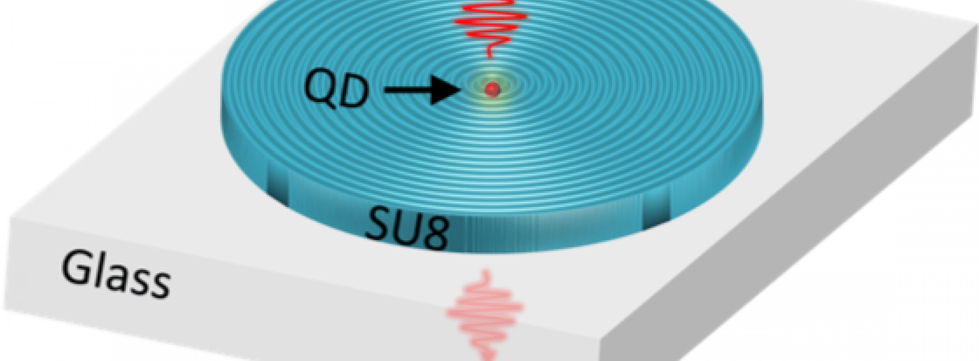 La technique d'écriture directe par laser (DLW) à faible absorption à un photon (LOPA) permet la fabrication de sous-microstructures photoniques multidimensionnelles. Ainsi, nous avons montré qu'un seul émetteur unique, tel qu’une boîte quantique (QD) ou un nanocristal de diamant contenant un défaut NV unique, pouvait être introduit avec une grande précision spatiale dans ces structures photoniques. Le couplage qui en résulte permet d’optimiser les propriétés de la source de photons uniques, en termes de rendement d’émission ou de temps de vie, comme l’a montré les thèses de T. H. Au (2019) et de G.L. Ngo (2023), qui ont réalisé le couplage d’une boîte quantique à une structure photonique à base de polymère. C’est un sujet très prometteur, et notre LOPA est unique pour ce type de couplage. Trois exemples de couplage sont montrés sur la figure ci-dessous.