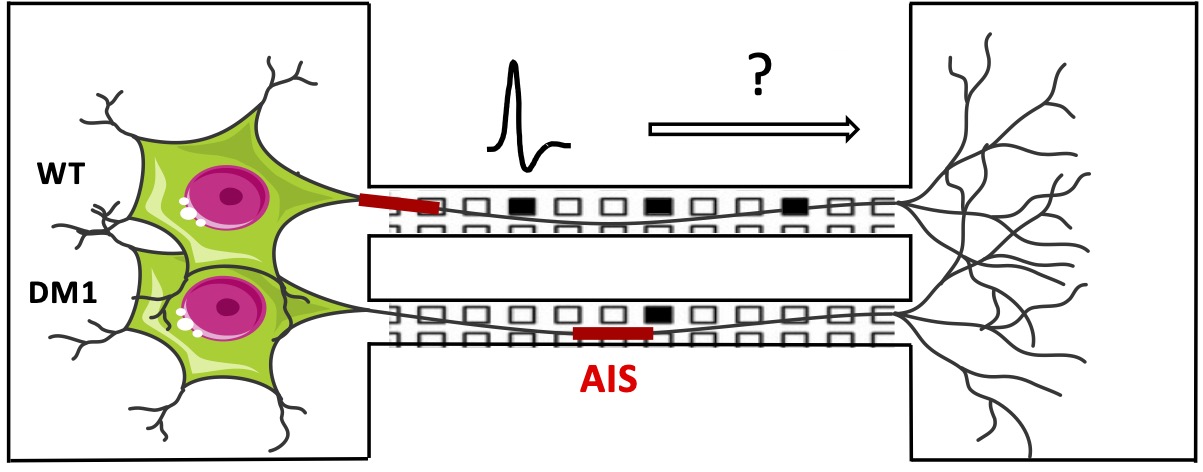Les travaux du consortium auquel nous participons visent à identifier les mécanismes pathologiques de la DM1 dans le système nerveux central en intégrant la neurobiologie cellulaire, la neurogénétique et la neurophysiologie, afin de développer de futures stratégies thérapeutiques. Ils visent quatre objectifs principaux. L'objectif qui nous concerne, est l’étude des déficits de transport vésiculaire axonal. Les expériences sont menées dans des circuits microfluidiques permettant d'isoler l'axone. Nous explorons l’interaction entre les anomalies structurelles des axones et celles du transport axonal. Les premières sont caractérisées par des analyses avancées d’imagerie et d’électrophysiologie utilisant des réseaux à haute densité de multiélectrodes, tandis que les secondes sont mesurées par vidéomicroscopie de fluorescence. Comprendre ces interactions est crucial pour appréhender la neuropathogenèse de la DM1. Les autres objectifs incluent la dissection moléculaire de la neuropathogenèse par transcriptomique et phospho-protéomique subcellulaires, et l’évaluation d’approches thérapeutiques, notamment la thérapie génique et le repositionnement de médicaments neuropharmacologiques.
