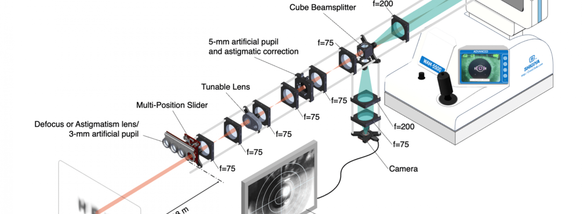 - Un banc optique couplé à un dispositif de mesures en continue de l’accommodation pour comparer la qualité de vision simulée et réellement perçue.